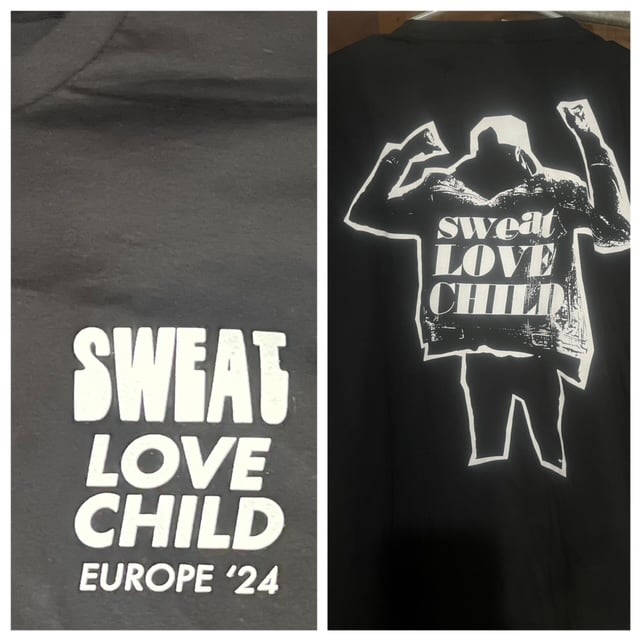 This is a two print black shirt, one large back print similar to the cover of the new LP and a front pocket print shown in pic 2 and 3 that says "Sweat Love Child Europe 2024" Get it now smoothbrain!